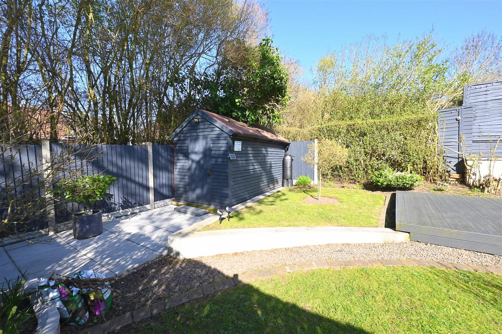 The property is set back from the road by a lawned front garden with gate and hedge border, sandstone paving and side access to the rear of the property. Pathway leads to entrance door.