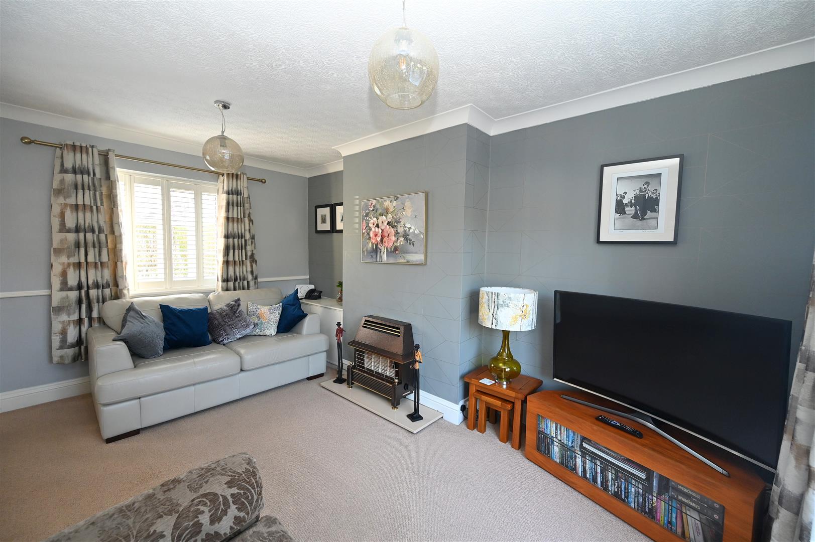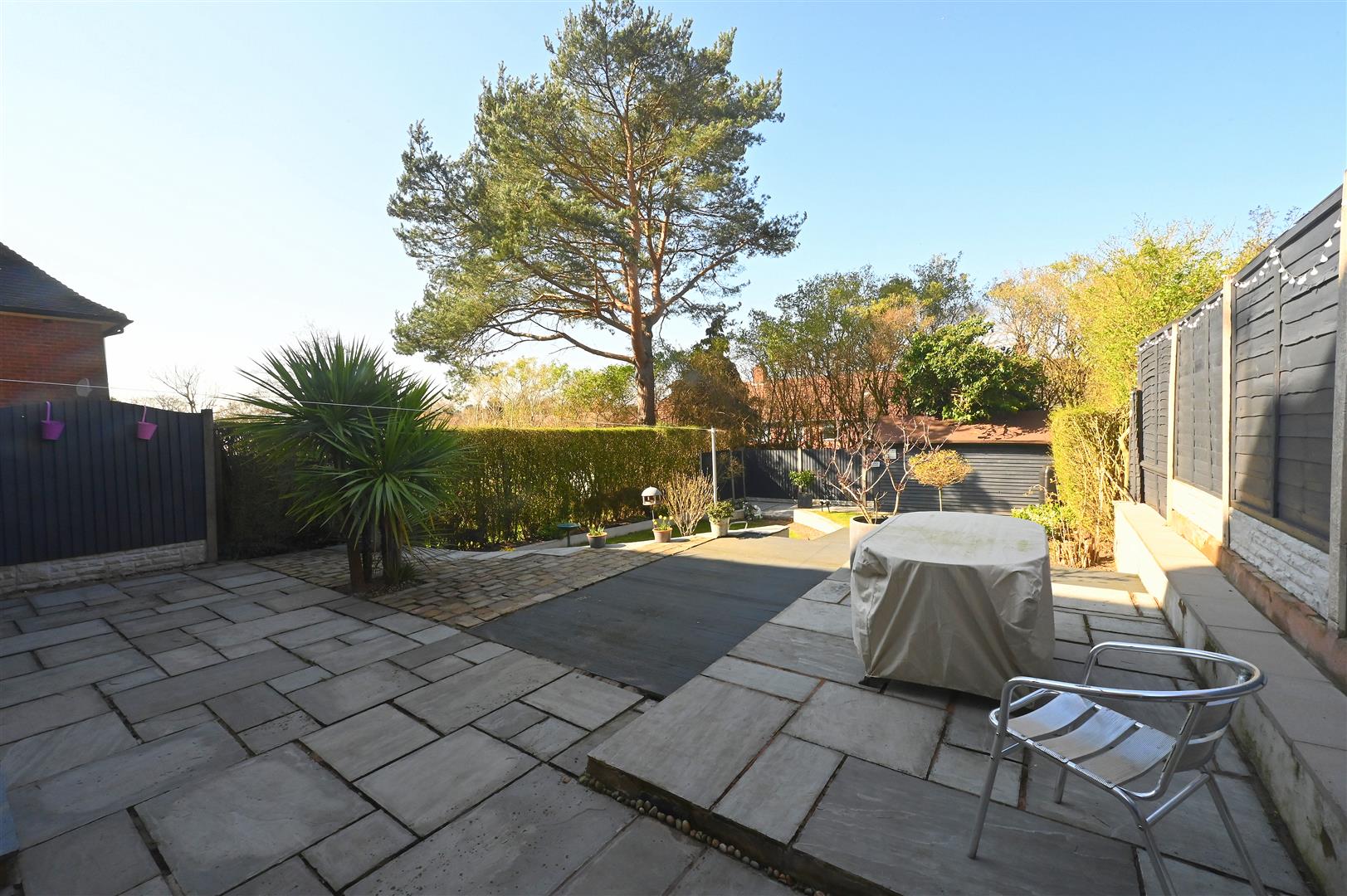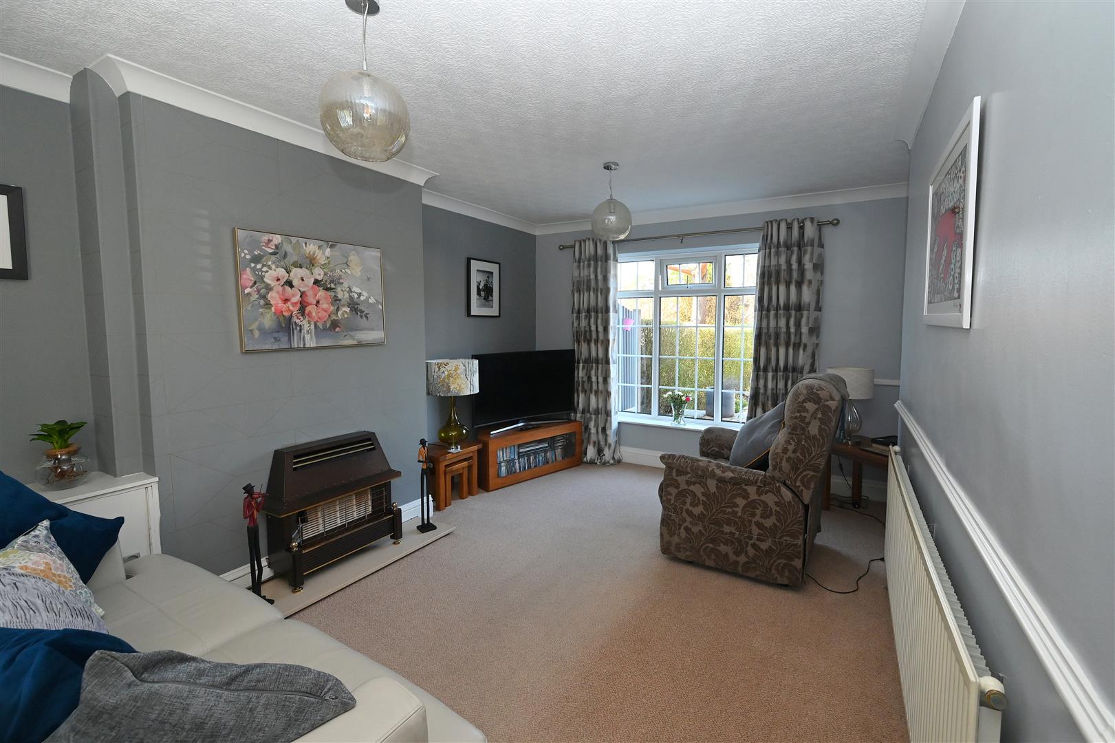 The property is set back from the road by a lawned front garden with gate and hedge border, sandstone paving and side access to the rear of the property. Pathway leads to entrance door.